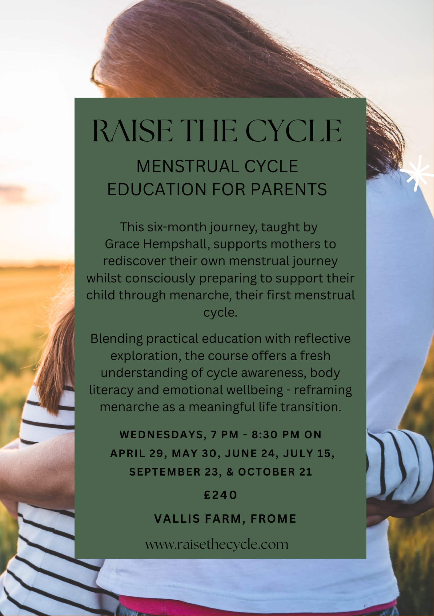 This six-month journey supports mothers to rediscover their own menstrual story while consciously preparing to support their child through menarche, their first menstrual period.